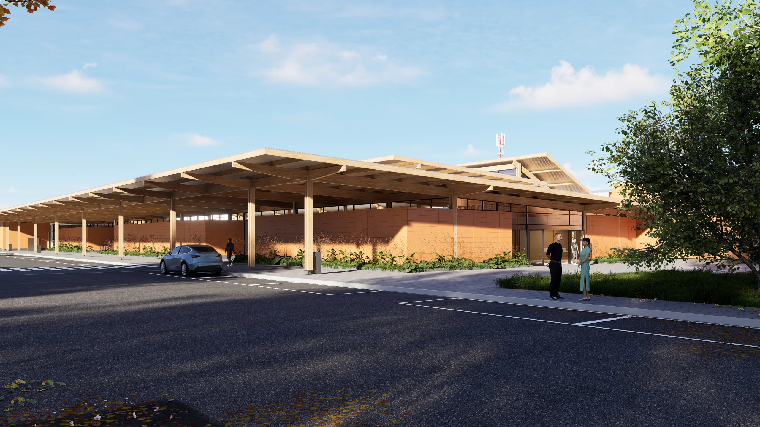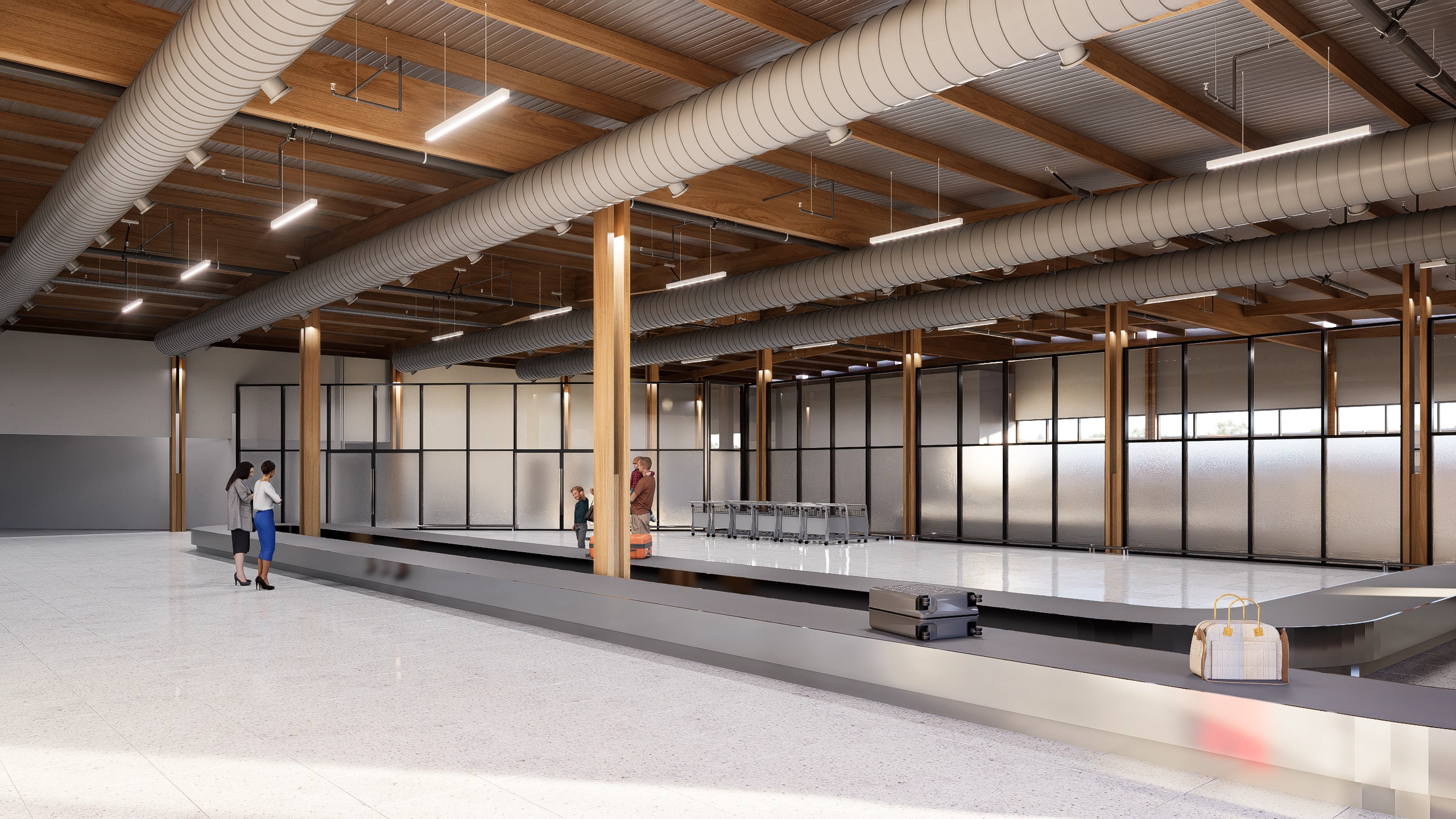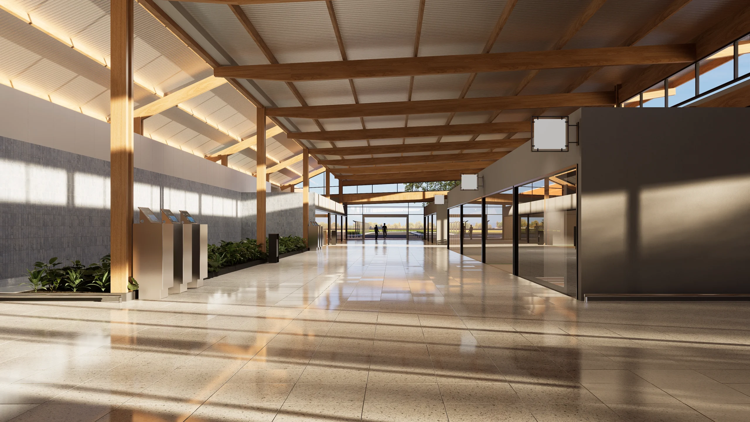 O boulevard frontal funciona como uma extensão do terminal, oferecendo um espaço híbrido para o pré-embarque e a interação social. Para evitar a paralisação das operações do aeroporto e atender à demanda por rápida execução, a madeira foi escolhida como material de impacto visual imediato na restauração. O uso da madeira traz a vantagem de proporcionar um processo construtivo eficiente na ampliação de um edifício existente, utilizando um método limpo de construção com componentes pré-fabricados.