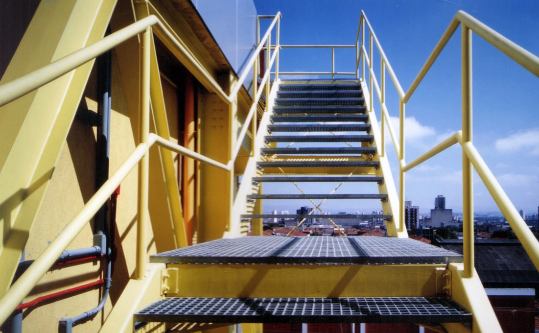 A estrutura metálica, composta por perfis soldados de aço carbono com ligações parafusadas, atende as necessidades de carga e principalmente de sobrecarga específicas de cada bloco.