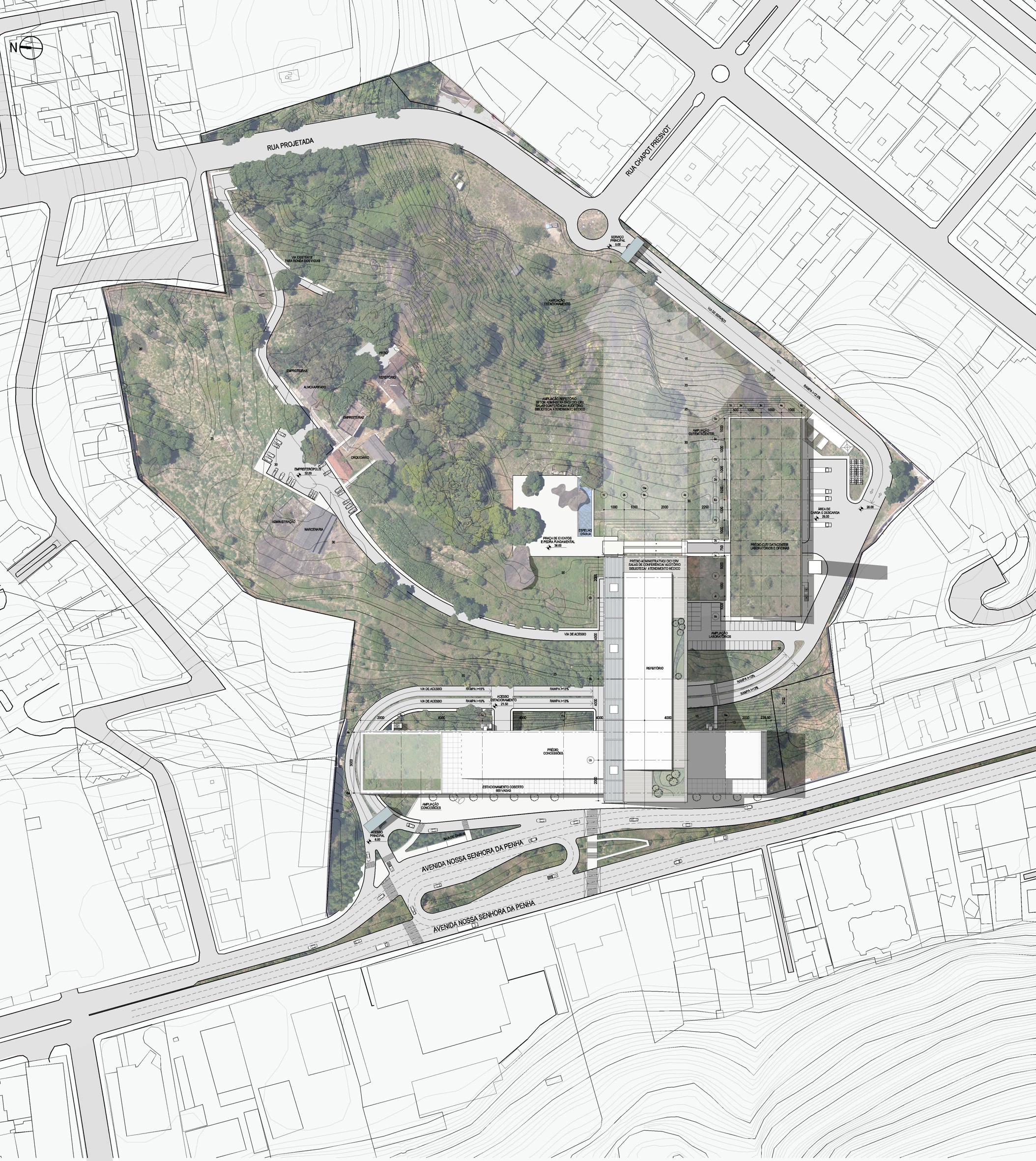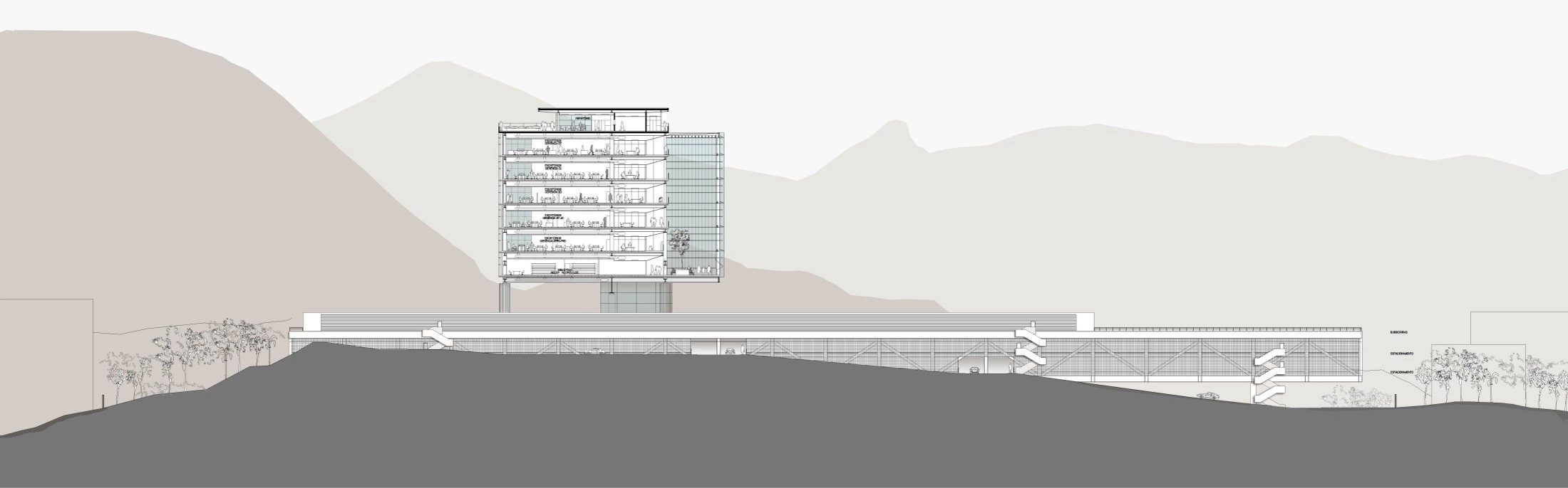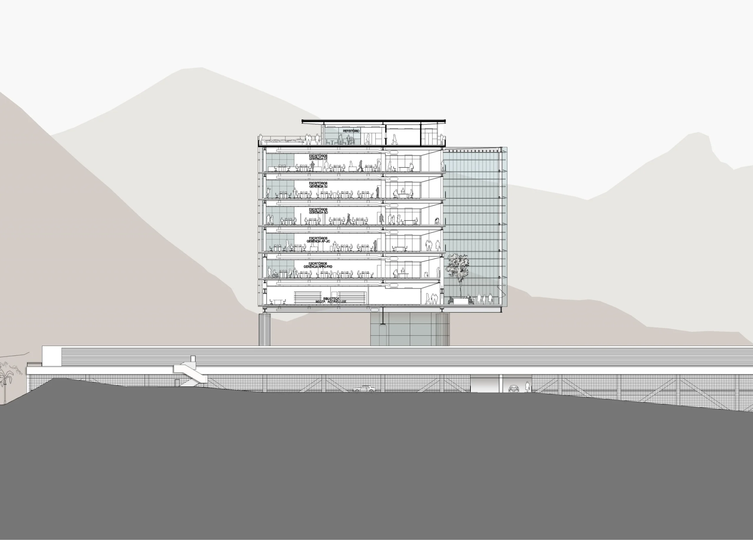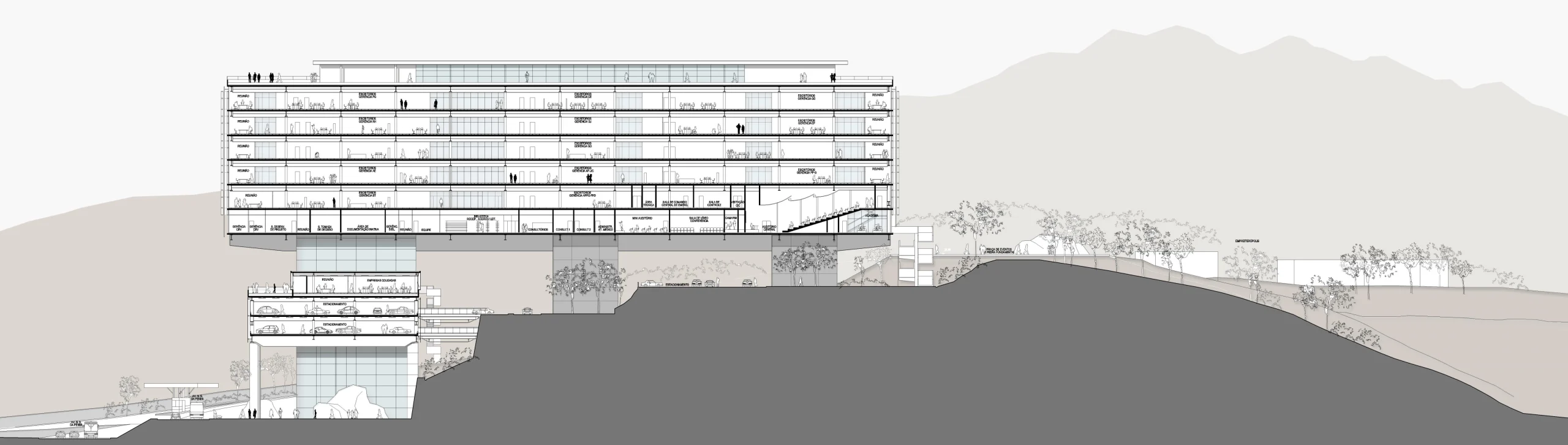 Reconhecendo a preocupação da Petrobras de minimizar o inevitável impacto do programa requerido, o projeto foi tratado com visão urbana. O conceito adotado foi a implantação de uma rua interna na cota +40 m, com um átrio, para distribuir as funções principais, e um edifício garagem horizontal próximo à rua principal, preservando a totalidade da montanha.
