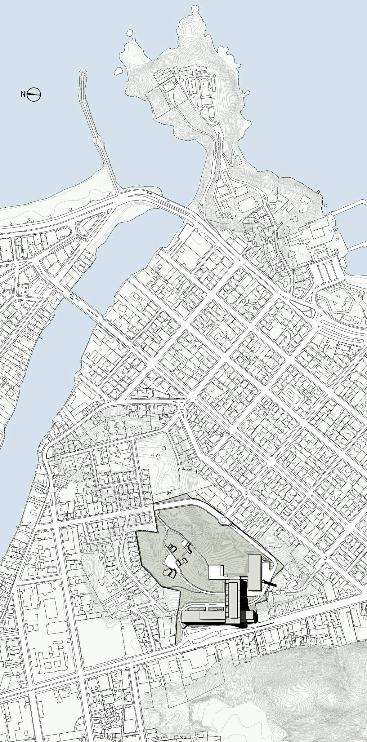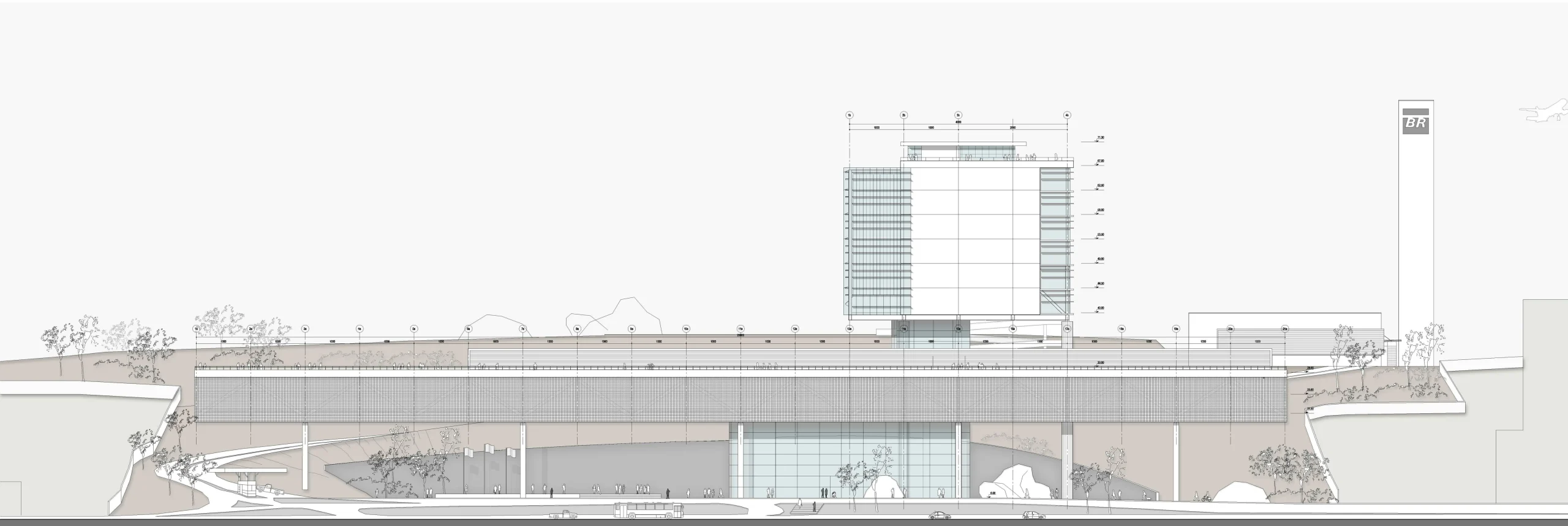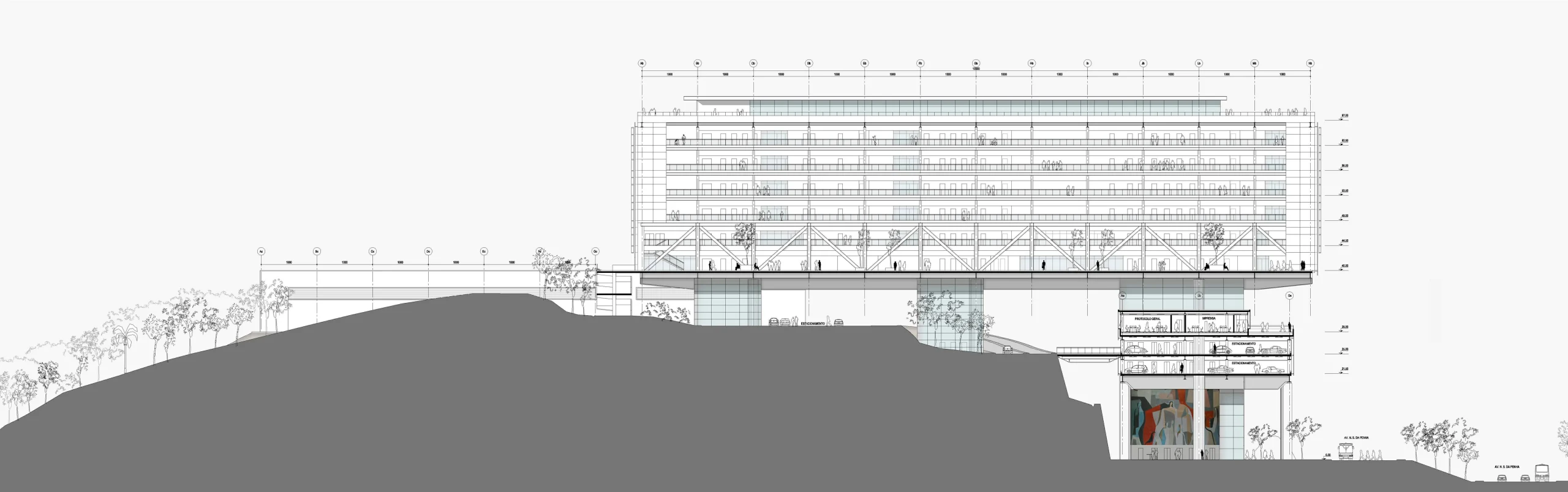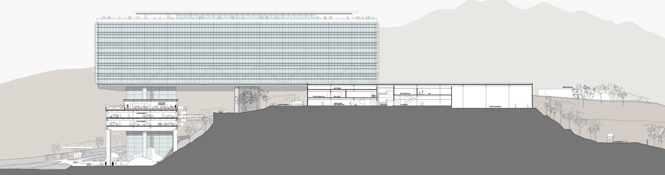 Reconhecendo a preocupação da Petrobras de minimizar o inevitável impacto do programa requerido, o projeto foi tratado com visão urbana. O conceito adotado foi a implantação de uma rua interna na cota +40 m, com um átrio, para distribuir as funções principais, e um edifício garagem horizontal próximo à rua principal, preservando a totalidade da montanha.